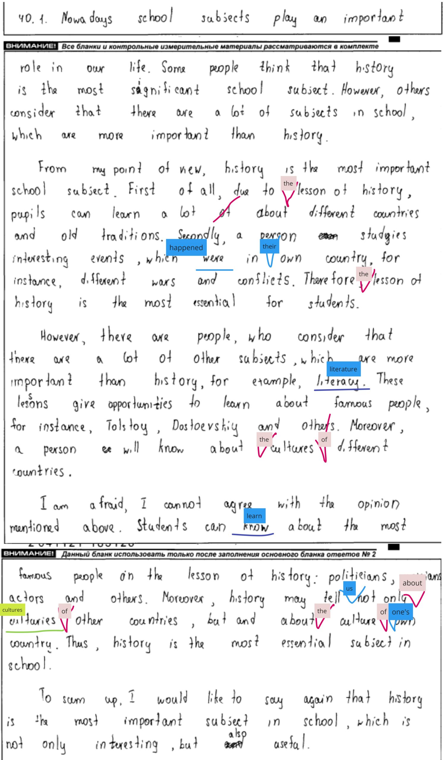 Вот тут серьёзная проблема – ученица вместо “literature” (литература) написала “literacy” (грамотность). Да, это будет ошибка в лексике, но о ней позже. Если на экзамене вот такое слово изменит весь смысл параграфа, то аспект считается нераскрытым и ставим за него “-“. Еще тут снова вместо одного предмета, который САМЫЙ важный в школе, написано “other subjects”, но это уже на дело сильно не влияет – итак параграф в минусе.